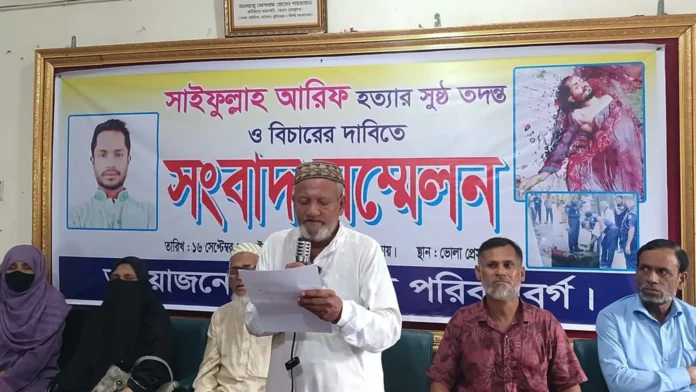 ভোলা উপজেলা সদরে ছাত্রলীগের সাবেক সহ-সভাপতি সাইফুল্লাহ আরিফের বাসার সামনে থেকে রক্তাক্ত লাশ উদ্ধারের ঘটনায় সুষ্ঠু তদন্ত ও বিচারের দাবি জানিয়েছে নিহতের পরিবার। মঙ্গলবার (১৬ সেপ্টেম্বর) সকালে ভোলা প্রেসক্লাবে এক সংবাদ সম্মেলনে এ দাবি জানান নিহত আরিফের বাবা বশির উদ্দিন মাস্টার। সংবাদ সম্মেলনে তিনি অভিযোগ করেন, ‘পুলিশ ঘটনাটি ধামাচাপা দিয়ে দুর্ঘটনা হিসেবে চালিয়ে দেওয়ার চেষ্টা করছে।’