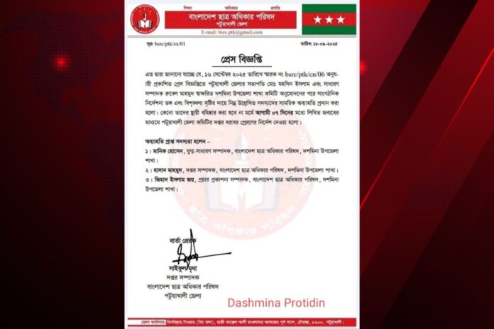 স্টাফ রিপোর্টার: পটুয়াখালী জেলার দশমিনা উপজেলা ছাত্র অধিকার পরিষদের তিন নেতাকে অস্থায়ীভাবে বহিষ্কার করেছে বাংলাদেশ ছাত্র অধিকার পরিষদ পটুয়াখালী জেলা শাখা। গত ১৬ সেপ্টেম্বর ২০২৫ তারিখে সংগঠনের জেলা সভাপতি মোঃ মহসিন ইসলাম এবং সাধারণ সম্পাদক রুবেল মাহমুদ স্বাক্ষরিত এক বিজ্ঞপ্তিতে জানানো হয়, সংগঠনের শৃঙ্খলা ভঙ্গ ও বিশৃঙ্খলা সৃষ্টি করার অভিযোগে উপজেলা শাখার কয়েকজন নেতাকে সাময়িক বহিষ্কার করা হয়েছে।