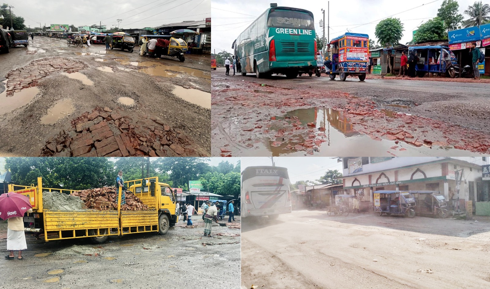 মহাসড়কের গৌরনদী উপজেলার বাটাজোর থেকে টরকী বন্দর পর্যন্ত সরেজমিনে দেখা গেছে, ইট-বালু দিয়ে মহাসড়ক সংস্কারের চিত্র।