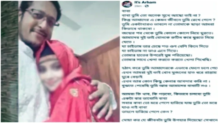 জন্মের পর থেকে তুমি কোলে কোলে ঘুরাতে, আবদার না করলেও সবকিছু এনে দিতে। এখন আমরা দুই ভাইবোন হাত ধরে রাস্তায় ঘুরি, কিছু চাইতে আর মুখ খুলি না। তুমি তো মারা যাওনি বাবা। তাহলে হারিয়ে গেলে কেন?’ আরহাম আরও লিখেছে, ‘আমরা কি খাবো, কিভাবে পড়াশোনা করবো, তুমি কি একবারও ভাবোনি? দোয়া করি বাবা, পৃথিবীটা যেন তোমার কাছে জান্নাত হয়ে যায়।’