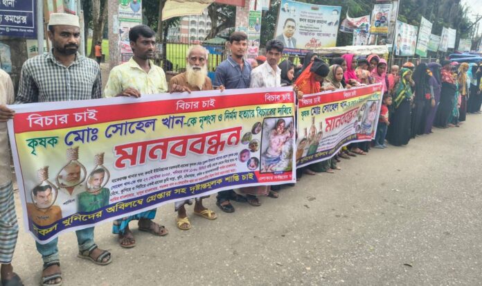 বক্তারা আরো বলেন, মামলা দায়ের করার পর থেকে সন্ত্রাসী শাহিন হাওলাদারের সন্ত্রাসী বাহিনী মামলা তুলে নিতে নিহত সোহেলের স্ত্রী সাজেদা বেগম ও মা নিলুফা বেগমকে অব্যাহত হুমকি দিচ্ছে। সোহেল হত্যার বাকি আসামিরা গ্রেফতার না হওয়ায় তার পরিবার চরম নিরাপত্তাহীনতায় দিন কাটাচ্ছেন। মানববন্ধনে উপস্থিত এলাকাবাসী অবিলম্বে কৃষক সোহেল খানের হত্যাকারীদের গ্রেফতার এবং বিচারের মাধ্যমে ফাঁসির দাবী জানান