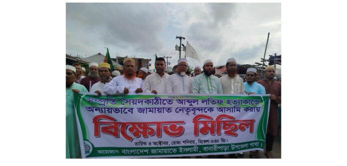রাহাদ সুমন, বিশেষ প্রতিনিধি: বরিশালের বানারীপাড়ায় উপজেলার সৈয়দকাঠী ইউনিয়ন কৃষক দলের সাধারণ সম্পাদক আবদুল লতিফ (৫৫) হত্যা মামলায় মসজিদের ইমামসহ তিন জামায়াত নেতাকে আসামী করার প্রতিবাদে বিক্ষোভ মিছিল ও সমাবেশ অনুষ্ঠিত হয়েছে। শনিবার (৪ অক্টোবর) বিকালে উপজেলা ও পৌর জামায়াতের উদ্যোগে বানারীপাড়া বন্দরবাজার ফেরিঘাট সংলগ্ন বেরিবাঁধ সড়ক থেকে মিছিলটি শুরু হয়ে পৌর শহরের প্রধান প্রধান সড়ক প্রদক্ষিণ করে ডাকবাংলো মোড়ে গিয়ে সমাবেশের মধ্য দিয়ে শেষ হয়।