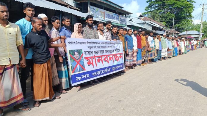 তারা আরও অভিযোগ করেন, হাসান সরদার এলাকায় ভয়ের ত্রাস সৃষ্টি করে রেখেছেন। তিনি নিয়মিত মানুষ নির্যাতন, সরকারি চাল আত্মসাৎ, শালিসি বাণিজ্য, ঘুষ ও দুর্নীতির সঙ্গে জড়িত। বক্তারা বলেন, গত ২৯ সেপ্টেম্বর দুই কিশোরকে চুরির অভিযোগে ধরে নিয়ে হাসান সরদার ও ইমরান বয়াতি হাত-পা বেঁধে নির্মমভাবে মারধর করেন। পরে ১০ হাজার টাকা জরিমানা দাবি করে সাদা কাগজে স্বাক্ষর নেন। নির্যাতনের ভয়ে এখন ভুক্তভোগী পরিবার এলাকা ছাড়া।