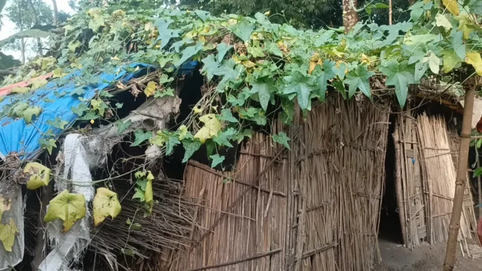 পাচ শতক জায়গার ওপরে চেড়াচটি ও পলিথিনের ঝুপড়ি ঘর বানিয়ে চলছে জীবনযাপন। বৃষ্টি হলেই ভিজে যাচ্ছে ঘরের কাথাকাপড় ও বাসনকোসন। পলিথিনের ছাউনি দিয়ে বৃষ্টির পানি ঝুপড়ি ঘরে পড়ে কাদামাটি সৃষ্টি হয়। তবে একটুখানি বাতাস হলেই নড়বড় করে ঝুপড়ি ঘরের চাল। ভারি বৃষ্টিতে কাঁদা পানির সঙ্গে যুদ্ধ করতে তাদের। দম্পতির কোলের শিশু বেশ কিছুদিন ধরে অসুস্থ।