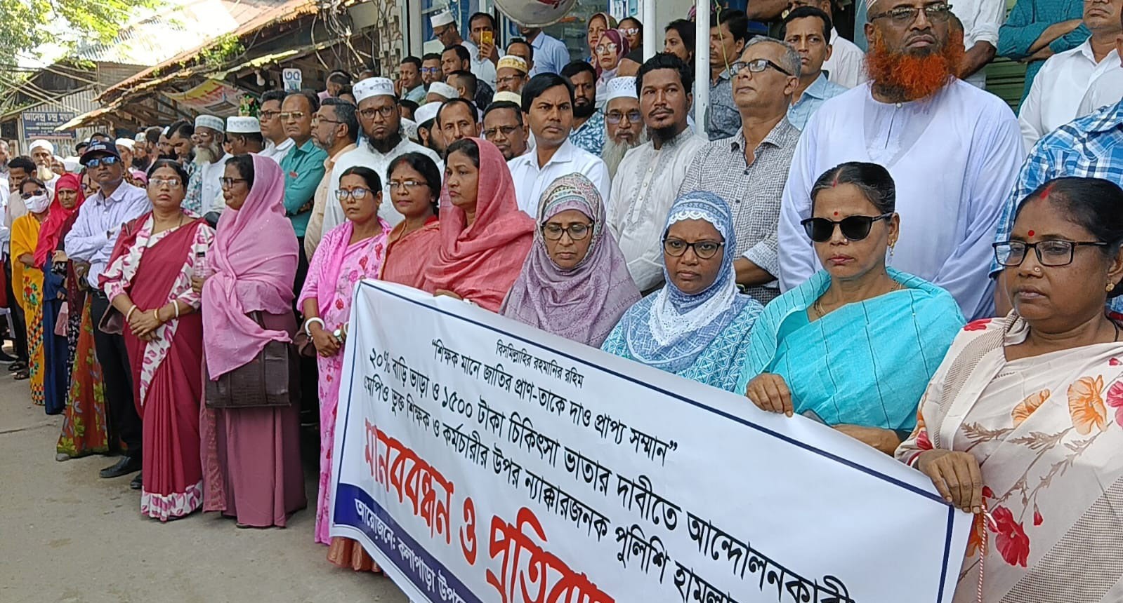 পটুয়াখালী প্রতিনিধি: ২০ ভাগ বাড়ি ভাড়া, পনেরশ টাকা চিকিৎসা ভাতা ও ৭৫ শতাংশ উৎসব ভাতার দাবিত ঢাকায় শিক্ষকদের সমাবেশে পুলিশি হামলার প্রতিবাদে পটুয়াখালীর কলাপাড়ায় মানববন্ধন ও প্রতিবাদ সভা করেছে এমপিওভুক্ত শিক্ষকরা।