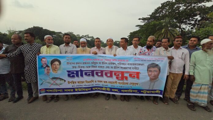 স্টাফ রিপোর্টার: ইলিশের প্রধান প্রজনন মৌসুমে মা ইলিশ আহরণ, পরিবহন ও বাজারজাতকরণ বন্ধে সচেতনতামূলক মানববন্ধন অনুষ্ঠিত হয়েছে। সোমবার (১৪ অক্টোবর ২০২৫) বিকাল সাড়ে ৫ টায় পটুয়াখালীর গলাচিপা উপজেলার গলাচিপা সদর ইউনিয়ন জাতীয়তাবাদী মৎস্যজীবী দলের আয়োজনে বোয়ালিয়া স্পিডবোর্ড ঘাট এলাকায় এ মানববন্ধনের অনুষ্ঠিত হয়।