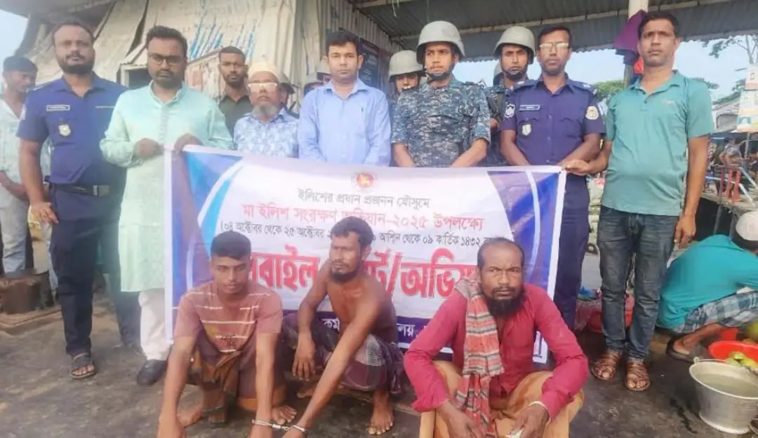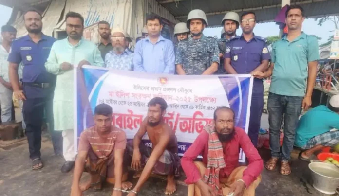 ভোলার লালমোহন উপজেলায় মা ইলিশ রক্ষায় যৌথ অভিযান পরিচালনা করা হয়েছে। শুক্রবার সকাল থেকে বিকেল পর্যন্ত উপজেলা প্রশাসন, মৎস্য দফতর, বাংলাদেশ নৌবাহিনী ও থানা পুলিশের উদ্যোগে তেঁতুলিয়া নদীতে এ অভিযান পরিচালনা করা হয়। এ সময় নিষেধাজ্ঞা অমান্য করে নদীতে মাছ শিকারের দায়ে ৩ জেলেকে আটক করা হয়।