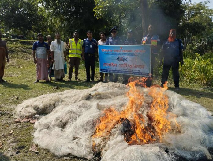 খবর পেয়ে আমরা দ্রুত অভিযান পরিচালনা করি।” তিনি আরও বলেন, “চলাভাঙ্গা ও ফুলঝুরি অঞ্চলে অভিযান চালিয়ে প্রায় ১০ হাজার মিটার অবৈধ কারেন্ট জাল ও প্রায় ৭ কেজি জাটকা ইলিশ জব্দ করা হয়েছে। পরে জনসম্মুখে জালগুলো আগুনে পুড়িয়ে ধ্বংস করা হয় এবং জব্দকৃত মাছ স্থানীয় একটি মাদ্রাসায় বিতরণ করা হয়।”