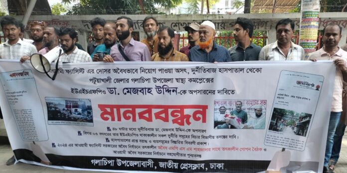 স্টাফ রিপোর্টার: পটুয়াখালীর গলাচিপা উপজেলা স্বাস্থ্য ও পরিবার পরিকল্পনা কর্মকর্তা (ইউএইচএফপিও) ডা. মেজবাহ উদ্দিনের অপসারণের দাবিতে ঢাকায় জাতীয় প্রেসক্লাবের সামনে মানববন্ধন অনুষ্ঠিত হয়েছে।