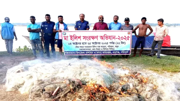 শনিবার উপজেলা প্রশাসন ও মৎস্য অধিদপ্তরের ইলিশ সংরক্ষণ অভিযানে নদী থেকে জব্দকৃত প্রায় ৩০ হাজার মিটার জাল নির্বাহী ম্যাজিস্ট্রেটের উপস্থিতিতে আগুনে পুড়িয়ে ধ্বংস করা হয়। সুগন্ধা, সন্ধ্যা ও আড়িয়াল খাঁ নদীতে ওই অভিযান পরিচালনাকালে বাবুগঞ্জ উপজেলা নির্বাহী অফিসার (ইউএনও) ফারুক আহমেদ, উপজেলা সিনিয়র মৎস্য কর্মকর্তা এ.এফ.এম নাজমুস সালেহীন, বাবুগঞ্জ থানার সেকেন্ড অফিসার সিনিয়র এসআই অরবিন্দ বিশ্বাস প্রমুখ উপস্থিত ছিলেন।