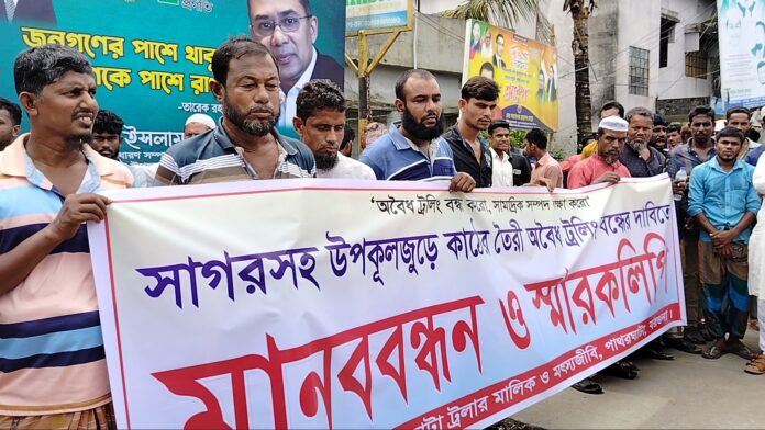 আরিফ তৌহীদ:পাথরঘাটা (বরগুনা) প্রতিনিধি- অবৈধ কাঠের ট্রলিং বন্ধের দাবিতে বরগুনার পাথরঘাটায় মানববন্ধন করেছে সাধারণ জেলেরা। রবিবার (১৯ অক্টোবর) সকাল ১১টার দিকে পাথরঘাটা উপজেলা শহরের গোলচত্বরে এ মানববন্ধন অনুষ্ঠিত হয়। মানববন্ধনে বক্তারা বলেন, অবৈধ কাঠের ট্রলিংয়ের কারণে উপকূলীয় এলাকায় ছোট ট্রলারের জেলেরা মারাত্মক ক্ষতির মুখে পড়ছেন।