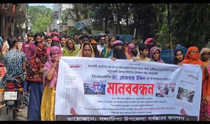 স্টাফ রিপোর্টার: পটুয়াখালীর গলাচিপায় ৫০ শয্যা বিশিষ্ট উপজেলা স্বাস্থ্য কমপ্লেক্সের অনিয়ম বন্ধ, সেবার মানোন্নয়নে ৯ দফা বাস্তবায়ন এবং উপজেলা স্বাস্থ্য ও পরিবার পরিকল্পনা কর্মকর্তা (ইউএইচএফপিও) ডা. মেজবাহ উদ্দিনের অপসারণের দাবিতে পুনরায় মানববন্ধন ও বিক্ষোভ মিছিল অনুষ্ঠিত হয়েছে।