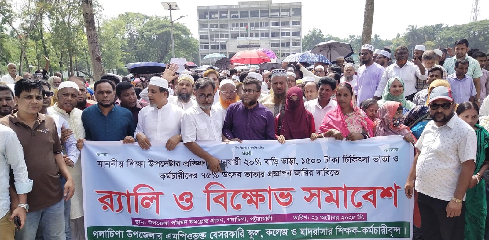 স্টাফ রিপোর্টার: এমপিওভুক্ত বেসরকারি শিক্ষক-কর্মচারীদের ঢাকায় চলমান আন্দোলনের সাথে একাত্মতা ঘোষণা করে পটুয়াখালীর গলাচিপায় বিক্ষোভ সমাবেশ হয়েছে। মঙ্গলবার বেলা ১১টায় উপজেলা পরিষদ কমপ্লেক্স প্রাঙ্গণ থেকে র্যালি ও বিক্ষোভ শেষে স্থানীয় পৌরমঞ্চে এক সমাবেশ অনুষ্ঠিত হয়।