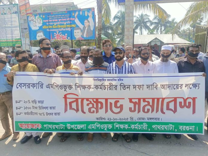 আরিফ তৌহীদ:পাথরঘাটা (বরগুনা) প্রতিনিধি- বেসরকারি এমপিওভুক্ত শিক্ষক-কর্মচারীদের তিন দফা দাবি আদায়ের লক্ষ্যে সারাদেশব্যাপী ঘোষিত কর্মসূচির অংশ হিসেবে বরগুনার পাথরঘাটায় বিক্ষোভ সমাবেশ অনুষ্ঠিত হয়েছে। আজ মঙ্গলবার (২১ অক্টোবর) সকাল সাড়ে ১১টার দিকে উপজেলার প্রাণকেন্দ্র গোলচত্বরে এ কর্মসূচি পালন করেন পাথরঘাটার বিভিন্ন শিক্ষা প্রতিষ্ঠানের শিক্ষক ও কর্মচারীরা।