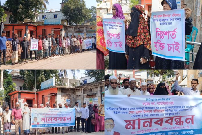 বৃহস্পতিবার (২৩ অক্টোবর) সকালে রাজাপুর প্রেসক্লাবের সামনে এলাকাবাসীর উদ্যোগে এ মানববন্ধন ও বিক্ষোভ মিছিল অনুষ্ঠিত হয়। এতে বিভিন্ন শ্রেণি-পেশার মানুষ অংশ নেন।