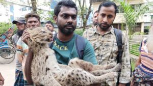 বরিশাল নগরীতে পুকুরপাড়ের জালে আটকা পড়ে স্থানীয়দের হাতে বন্দী হয়েছে একটি মেছো বাঘ। বৃহস্পতিবার সকালে রূপাতলী বটতলা এলাকায় স্থানীয়রা প্রাণিটিকে বেঁধে রেখে বন বিভাগকে খবর দেয় বলে জানিয়েছেন ওয়াইল্ড লাইফ এনিমেল রেসকিউ টিমের প্রতিষ্ঠাতা জজ তালুকদার।