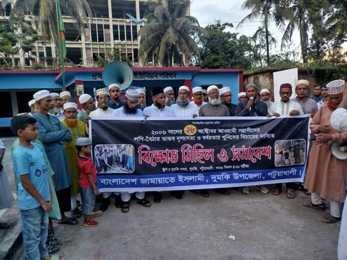 মেহেদী হাসান শান্ত, দুমকি প্রতিনিধিঃ ২০০৬ সালের (২৮অক্টোবর) আওয়ামীলিগের লাঠি- বৈঠার তাণ্ডব নৃশংসতা ও বর্বরতায় খুনিদের বিচারের দাবিতে বাংলাদেশ জামাতে ইসলামি দুমকি উপজেলা শাখার উদ্যোগে বিক্ষোভ মিছিল ও সমাবেশ অনুষ্ঠিত হয়েছে।