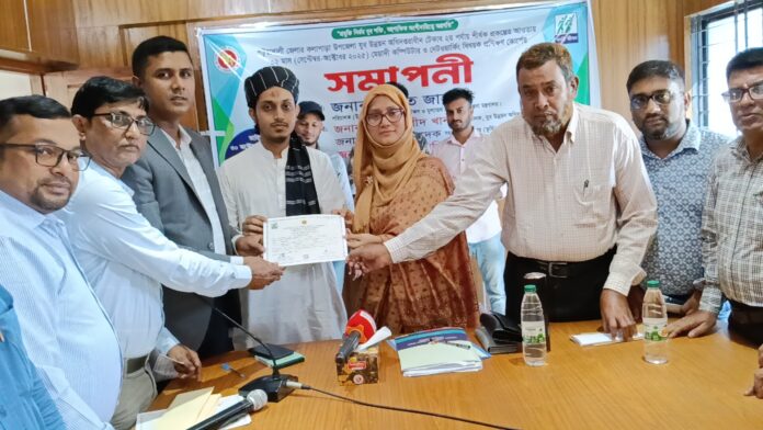 কলাপাড়া ( পটুয়াখালী) প্রতিনিধি : পটুয়াখালীর কলাপাড়া উপজেলা যুব উন্নয়ন অধিদপ্তরাধীন “টেকাব ২য় পর্যায়” শীর্ষক প্রকল্পের আওতায় দুই মাসব্যাপী (সেপ্টেম্বর-অক্টোবর ২০২৫) কম্পিউটার ও নেটওয়ার্কিং বিষয়ক প্রশিক্ষণ কোর্সের সমাপনী অনুষ্ঠান অনুষ্ঠিত হয়েছে। বৃহস্পতিবার (৩০ অক্টোবর) দুপুরে উপজেলা প্রশাসন ও উপজেলা যুব উন্নয়ন কর্মকর্তার কার্যালয়ের আয়োজনে উপজেলা প্রশাসন সভাকক্ষে এ সমাপনী অনুষ্ঠান অনুষ্ঠিত হয়।