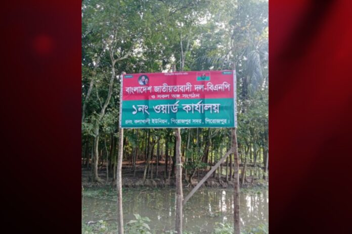 পিরোজপুর প্রতিনিধিঃ পিরোজপুর সদর উপজেলার কলাখালী ইউনিয়নের কলাখালী গ্রামে এক প্রবাসীর কেনা জমিতে বি এন পি দলীয় সাইনবোর্ড টানিয়েছে সিদ্দিক হাওলাদার নামে এক ব্যাক্তি। সে ওয়ার্ড বি এন পির নেতা। জমির মালিক প্রবাসী কাজী বাহাদুর জানান, তার বাড়ী কলাখালী ইউনিয়নের দাউদপুর গ্রামে।