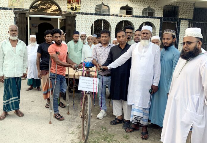 আগৈলঝাড়া (বরিশাল) প্রতিনিধিঃ ট্রাকের চাপায় পা হারানো পঙ্গু হয়ে ভিক্ষা করে মা, বোন ও স্ত্রী—সন্তান নিয়ে বহু কষ্টে দিনযাপন করে আসছিলো আব্দুর রাজ্জাক শেখ (৩২)। তাকে নগরবাড়ি জামে মসজিদের সামনে বসে একটি ভ্যানগাড়ি উপহার দিয়েছে বরিশালের আগৈলঝাড়া উপজেলার নগরবাড়ি যুবসমাজ। সে আর ভিক্ষাবৃত্তি না করে ভ্যানগাড়ি চালিয়ে কাজ করে জীবিকা নির্বাহ করবে বলে জানিয়েছে।
