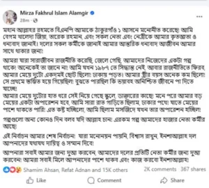 আমরা সবাই মিলে আপনাদের পাশে থাকব এবং কাজ করবো ইনশাআল্লাহ! পোস্টের শুরুতে তিনি বলেন, মহান আল্লাহর রহমতে বিএনপি আমাকে ঠাকুরগাঁও-১ আসনে মনোনীত করেছে। আমি বেগম খালেদা জিয়া, তারেক রহমান, সকল নেতা এবং নেত্রীকে আমার কৃতজ্ঞতা ও ধন্যবাদ জানাই।