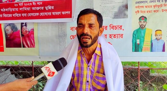 এর আগে মোশারফ হোসেন একই দাবিতে গত ৪ নভেম্বর বিকেলে কেন্দ্রীয় শহীদ মিনার চত্বরে মানববন্ধন ও প্রতিবাদ সভা করেন। মোশারফ হোসেন মঠবাড়িয়া পৌর শহরের সবুজ নগর এলাকার চান মিয়া হাওলাদারের ছেলে। মোশারফ হোসেন কান্নাজড়িত কণ্ঠে জানান, ২০২৩ সালের ২০ মার্চ ১০ম শ্রেণিতে পড়ুয়া তার মেয়ে লামিয়া আক্তার মুন্নি নৃশংসভাবে খুন হয়।