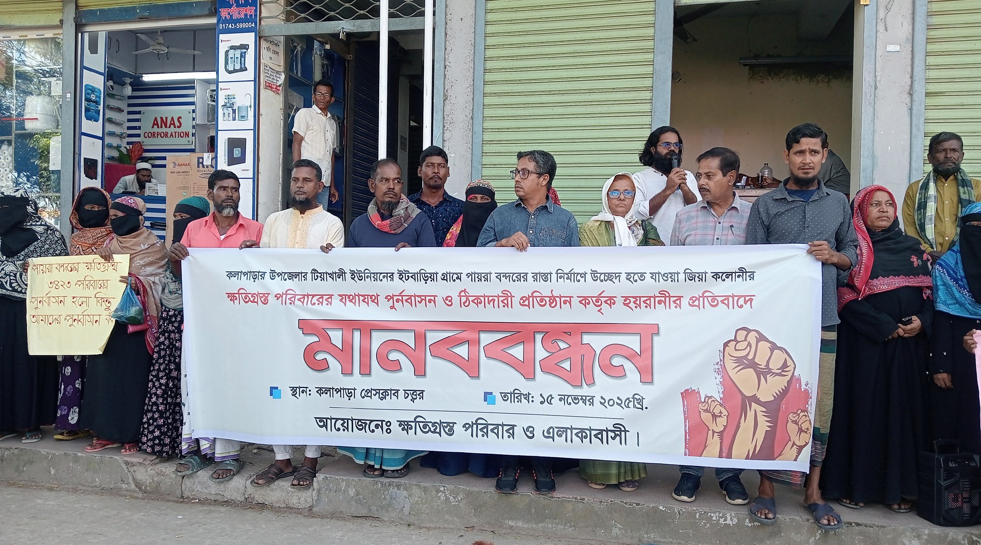 একই সাথে ঠিকাদারী প্রতিষ্ঠানের হয়রানি বন্ধ করে বাকি পরিবারগুলোর জন্য নদী থেকে যথেষ্ঠ দূরে এবং উঁচু জমিতে যথাযথ পুনর্বাসনের ব্যবস্থা গ্রহণের দাবী জানায়। মানববন্ধনে বক্তব্য রাখেন ক্ষতিগ্রস্থ পরিবারের সদস্য মোঃ ফোরকান হাওলাদার, মোঃ ইব্রাহিম শিকারী, লাইলী বেগম, কবির হোসেন, জসিম প্যাদা, সালেহা বেগম, আল আমিন খান ।