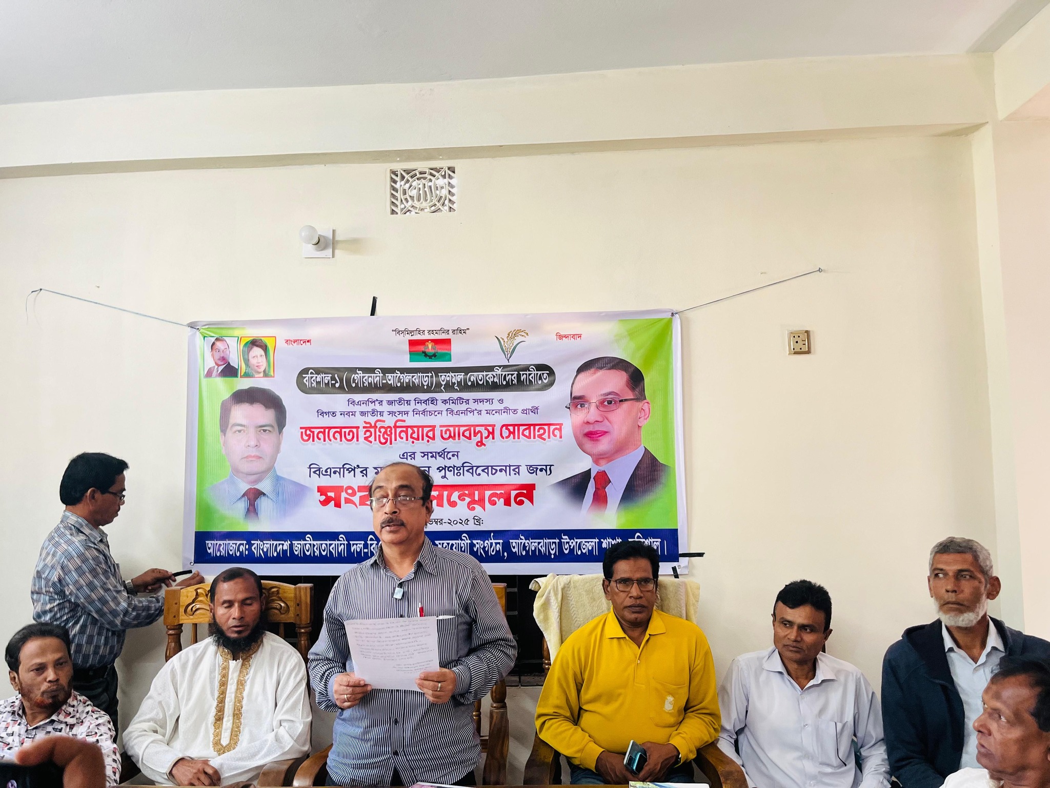 আগৈলঝাড়া (বরিশাল) প্রতিনিধিঃ ত্রয়োদশ জাতীয় সংসদ নির্বাচনে বরিশাল—১ (গৌরনদী—আগৈলঝাড়া) আসনে বিএনপি’র মনোনয়ন পুনঃবিবেচনার জন্য আগৈলঝাড়ায় সংবাদ সম্মেলন অনুষ্ঠিত হয়েছে। মনোনয়ন প্রত্যাশী বিএনপি নির্বাহী কমিটির সদস্য ইঞ্জিনিয়ার আব্দুস সোবাহান সমর্থক তৃণমূল নেতাকমীর্রা গতকাল সোমবার সকালে আগৈলঝাড়া প্রেসক্লাব মিলনায়তনে সংবাদ সম্মেলন করেছেন।