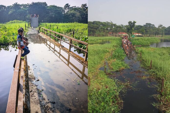 প্রায় এক মাস আগে সেতুর মাঝখানে ফাটল ধরে ভেঙে যায়। এরপরও মানুষ ঝুঁকি নিয়ে চলাচল করছিল। সেতুটি নির্মাণের জন্য মানববন্ধন করেছিল এলাকাবাসী। কিন্তু সপ্তাহখানেক আগে হঠাৎ সেতুর পূর্ব পাশের অংশ সম্পূর্ণ ধ্বসে পড়ে খালে। ফলে দুই পাড়ের যোগাযোগ এখন পুরোপুরি বিচ্ছিন্ন হয়ে গেছে। চলাচলের বিকল্প পথ না থাকায় স্থানীয়রা নিজেদের উদ্যোগে ডিঙি নৌকা চালু করেছেন। জনপ্রতি ৫ টাকা ভাড়া দিয়ে প্রতিদিন শত শত মানুষ ভয়ে-আতঙ্কে খাল পারাপার হচ্ছেন।