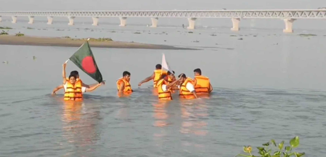 পরবর্তীতে ৬ কিলোমিটার নদীপথ সাতরে পার হওয়ার উদ্যোগ নেন লংমার্চকারীরা। তাদের মধ্যে ১০ জন সাঁতার শুরু করলেও কিছুদূর এগিয়ে নোমান হাওলাদার ও তানজিম নামে দুইজন অসুস্থ হয়ে পড়েন। স্থানীয়দের সহায়তায় তাদের উদ্ধার করে শিবচরের পাচ্চর এলাকার একটি বেসরকারি হাসপাতালে ভর্তি করা হয়।