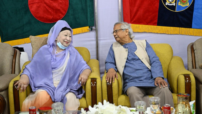 প্রধান উপদেষ্টা অধ্যাপক ড. মুহাম্মদ ইউনূসের সঙ্গে বিএনপি চেয়ারপারসন বেগম খালেদা জিয়ার একান্ত বৈঠক অনুষ্ঠিত হয়েছে। শুক্রবার (২১ নভেম্বর) ঢাকা সেনা নিবাসে সেনাকুঞ্জে এ বৈঠক অনুষ্ঠিত হয়। বিষয়টি নিশ্চিত করে বিএনপি চেয়ারপারসনের মিডিয়া উইংয়ের কর্মকর্তা শায়রুল কবির খান জানান, খালেদা জিয়া সেনাকুঞ্জে পৌঁছানোর পর অন্তর্বর্তীকালীন সরকারের প্রধান উপদেষ্টা ড. মুহাম্মদ ইউনূসের সঙ্গে একান্তে কয়েক মিনিট কথা বলেন।
