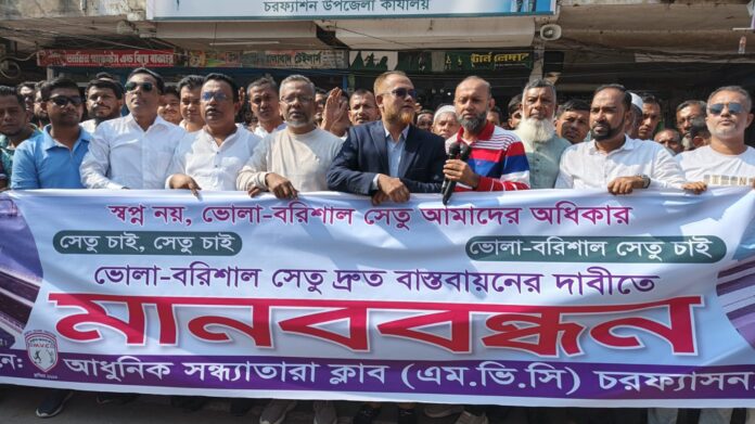 বক্তব্যতে বক্তারা বলেন, ভোলা বাংলাদেশের একমাত্র বিচ্ছিন্ন দ্বীপ জেলা, যেখানে রয়েছে প্রাকৃতিক গ্যাস, মাছ, কৃষি ও পর্যটনের বিশাল সম্ভাবনা। তবে সেতুর অভাবে বিনিয়োগ ও শিল্প উন্নয়ন ব্যাহত হচ্ছে। দীর্ঘদিন ধরে দাবি জানানো হলেও সরকার এখনো দৃশ্যমান কোনো পদক্ষেপ নেয়নি।