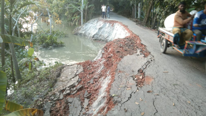 সরেজমিনে দেখা যায়— দীর্ঘদিন ধরে ভাঙনের কবলে থাকা সড়কটি হঠাৎ করেই নদীতে তলিয়ে গেছে। এ সড়ক দিয়ে প্রতিদিন উজিরপুর, কোটালিপাড়া ও খুলনার বিভিন্ন এলাকার মানুষ যাতায়াত করেন। স্থানীয় কৃষক ও মৎস্যচাষিরা জানান, সড়কটি সম্পূর্ণ নষ্ট হয়ে গেলে শতকোটি টাকার মাছ ও ধানের ক্ষতি হবে। স্থানীয় বাসিন্দারা অভিযোগ করেন, নদী থেকে অবৈধ বালু উত্তোলন ও স্রোতের তীব্রতার কারণেই সড়কটি দ্রুত ভাঙনের মুখে পড়ে।
