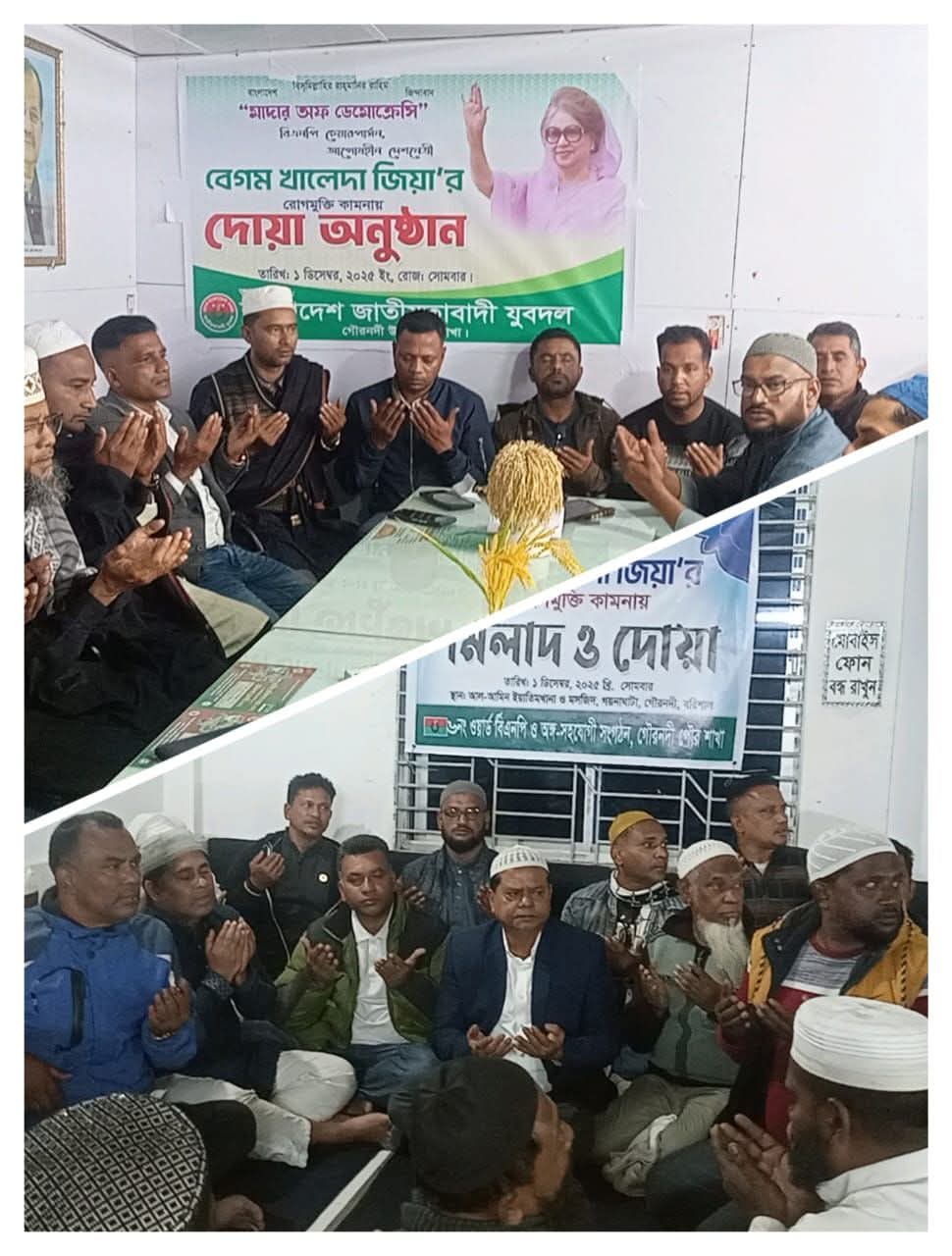 বাংলাদেশ জাতীয়তাবাদী যুবদল গৌরনদী উপজেলা শাখার আয়োজনে বিএনপি চেয়ারপারসন ও মাদার অব ডেমোক্রেসি বেগম খালেদা জিয়ার রোগমুক্তি কামনায় সোমবার বাদ আছর থেকে সন্ধ্যা পর্যন্ত দুটি দোয়া মাহফিল অনুষ্ঠিত হয়েছে। রাজনৈতিক অঙ্গনে দোয়া কর্মসূচি ঘিরে এলাকায় দলীয় নেতাকর্মীদের মাঝে উৎসাহ-উদ্দীপনা দেখা যায়।