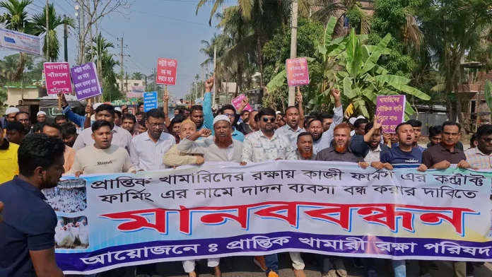 বরিশালের ভোলাতে কাজী ফার্মসের কন্টাক্ট ফার্মিংয়ের নামে দাদন ব্যবসা বন্ধ করার দাবিতে মানববন্ধন, বিক্ষোভ মিছিল ও স্মারলিপি প্রদান কর্মসূচি অনুষ্ঠিত হয়েছে। বুধবার (০৩ ডিসেম্বর) বোরহানউদ্দিন উপজেলার কুঞ্জের হাট বাজারসংলগ্ন কাজী ফার্ম ভোলা ব্যাঞ্চ অফিসের সামনে প্রান্তিক খামারি রক্ষা পরিষদের ব্যানারে ঘণ্টাব্যাপী এ মানববন্ধন ও বিক্ষোভ অনুষ্ঠিত হয়।