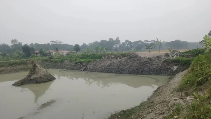 সরেজমিনে গিয়ে দেখা গেছে, বন্যা নিয়ন্ত্রণ বাঁধের ঢালের চরের মাটি এমনভাবে গভীর করে কাটায় যে কোনো সময় বাঁধ ধসে পড়তে পারে বলে ধারণা করা হচ্ছে।