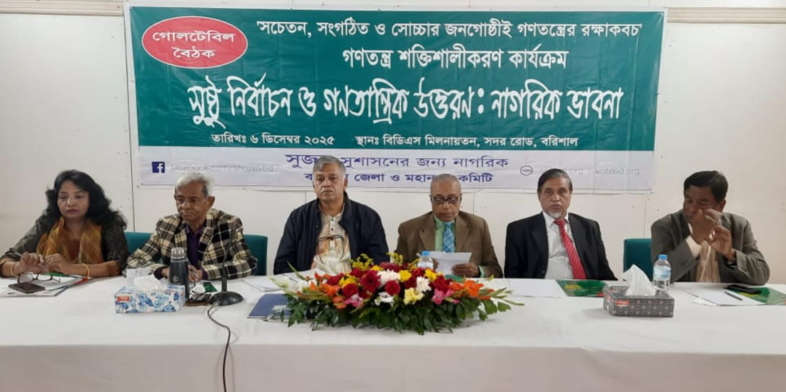 শনিবার (৬ ডিসেম্বর) সকাল দশটা থেকে দুপুর একটা পর্যন্ত বরিশাল নগরীর বিডিএস মিলনায়তনে সুশাসনের জন্য নাগরিক (সুজন) এর বরিশাল জেলা ও মহানগর কমিটির আয়োজনে গোলটেবিল বৈঠকে প্রধান আলোচক ছিলেন-সুজনের কেন্দ্রীয় কমিটির সমন্বয়কারী দিলীপ কুমার সরকার। সুজনের বরিশাল জেলা কমিটির সভাপতি গাজী জাহিদ হোসেনের সভাপতিত্বে অতিথি হিসেবে বক্তব্য রাখেন মহানগর কমিটির সভাপতি আব্দুল মোতালেব হাওলাদার, সাধারণ সম্পাদক রফিকুল আলম, জেলা কমিটির সাধারণ সম্পাদক রনজিত দত্ত, সুজনের আঞ্চলিক সমন্বয়কারী মেহের আফরোজ মিতাসহ অন্যান্যরা।