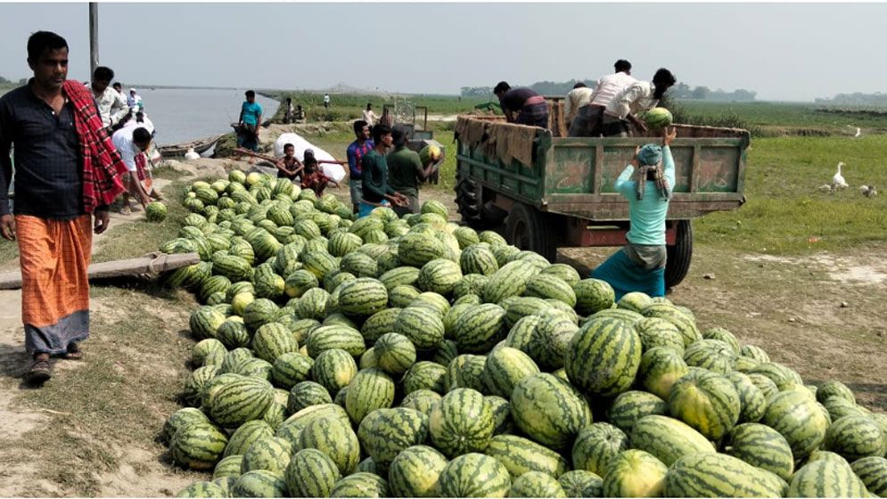 থাকা খাওয়া তরমুজ চাষির। এই জমির পাশে টং ঘরে রাতে ঘুমাই, দিনে কাজ করি।’ মো. হোসেন এর মতো একই চরে হাজারখানেক শ্রমিক তরমুজ চাষের জমিতে কর্ম ব্যস্ত সময় পার করছেন। ওই সময় তরমুজ গাছের পরিচর্যা করছিলেন মুজিব নগর ইউনিয়নের তরমুজ চাষি মো. ইসমাইল। তরমুজ আবাদের বিষয়ে কথা হয় তার সাথে। তিনি তার কাজ শেষে বলেন, ‘১৩ একর জমিতে থাই সুপার, থাই কিং ও আরলি ওয়ান জাতের তরমুজ চাষ করেছি।