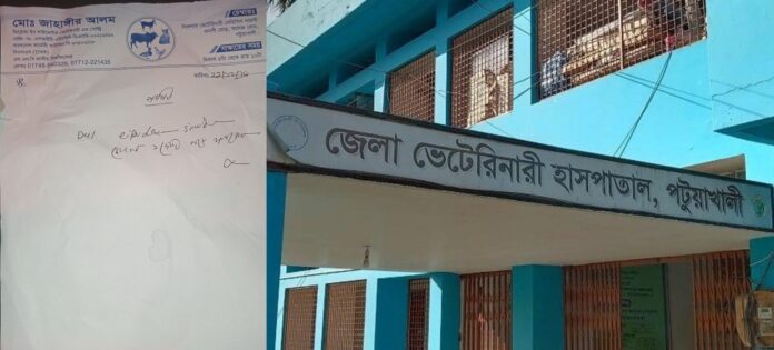 সরেজমিনে পটুয়াখালী জেলা প্রাণিসম্পদ হাসপাতালে গিয়ে দেখা যায়, চিকিৎসক না থাকায় অসুস্থ পশুর চিকিৎসা দিচ্ছেন অফিস সহকারী কাম কম্পিউটার অপারেটর মো. জাহাঙ্গীর আলম। পশু-পাখির নাম রেজিস্ট্রারভুক্ত না করেই দায়সারাভাবে কাগজে লিখে দিচ্ছেন ওষুধ।