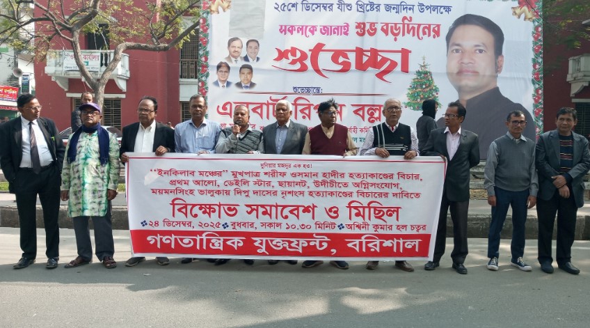 আজ বুধবার (২৪ ডিসেম্বর) সকালে নগরীর অশ্বিনী কুমার হল চত্বর এলাকায় এ কর্মসূচির আয়োজন করে গণতান্ত্রিক যুক্তফ্রন্ট, বরিশাল। ব্যানার ও ফেস্টুন হাতে নিয়ে অংশগ্রহণকারীরা বিভিন্ন স্লোগান দেন এবং হত্যাকাণ্ডের বিচারহীনতার বিরুদ্ধে ক্ষোভ প্রকাশ করেন।