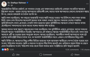 ডা. শফিকুর রহমনা লিখেন, আমি তখন বলেছিলাম, গত বছরের মাঝামাঝি সময়ে আমি অসুস্থ হওয়ার পর চিকিৎসা শেষে যখন বাসায় ফিরি, তখন দেশ-বিদেশের অনেকেই আমার সঙ্গে সাক্ষাৎ করতে আসেন। অন্যান্য দেশের সম্মানিত কূটনৈতিকবৃন্দ যেমন এসেছেন, তেমনি তখন ভারতের দুজন কূটনীতিকও আমাকে দেখতে আমার বাসায় এসেছিলেন। অন্যান্যদের মতো তাদের সঙ্গেও আমার কথা হয়েছে।