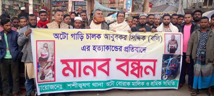 জে এইচ রাজু স্টাফ রিপোর্টার: অটো চালককে হত্যা করে গাড়ি ছিনতাইয়ের ঘটনায় জড়িতদের গ্রেফতারের দাবিতে শশীভূষন থানা অটো মালিক ও চালকদের মানববন্ধন অনুষ্ঠিত হয়েছে।