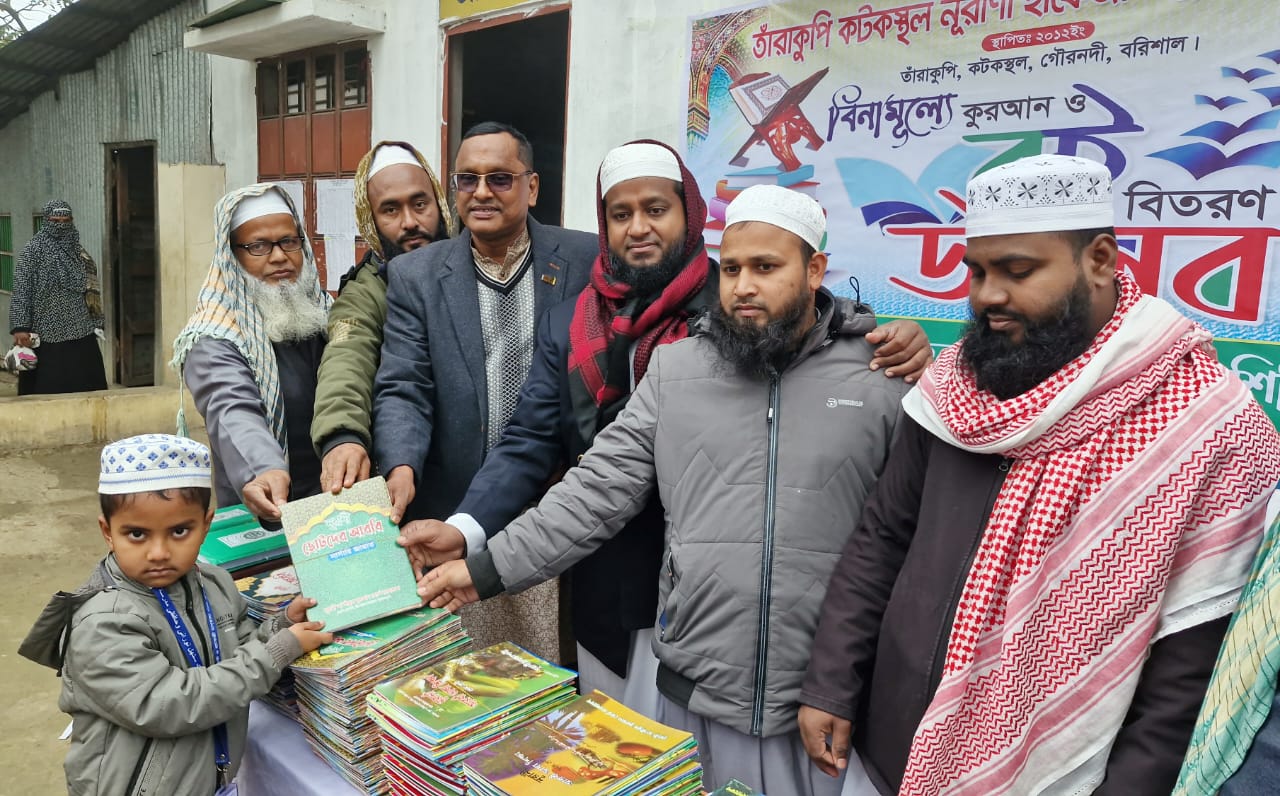 রাহাদ সুমন, বিশেষ প্রতিনিধি বরিশালের গৌরনদী উপজেলার বার্থী ইউনিয়নের তাঁরাকুপি-কটকস্থল নূরানী হাফেজী মাদ্রাসা ও এতিমখানায় দুই শতাধিক শিক্ষার্থীদের মাঝে বিনামূল্যে কুরআন শরীফ ও বই বিতরণ করা হয়েছে।