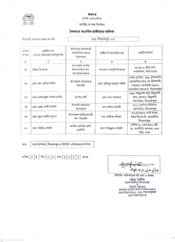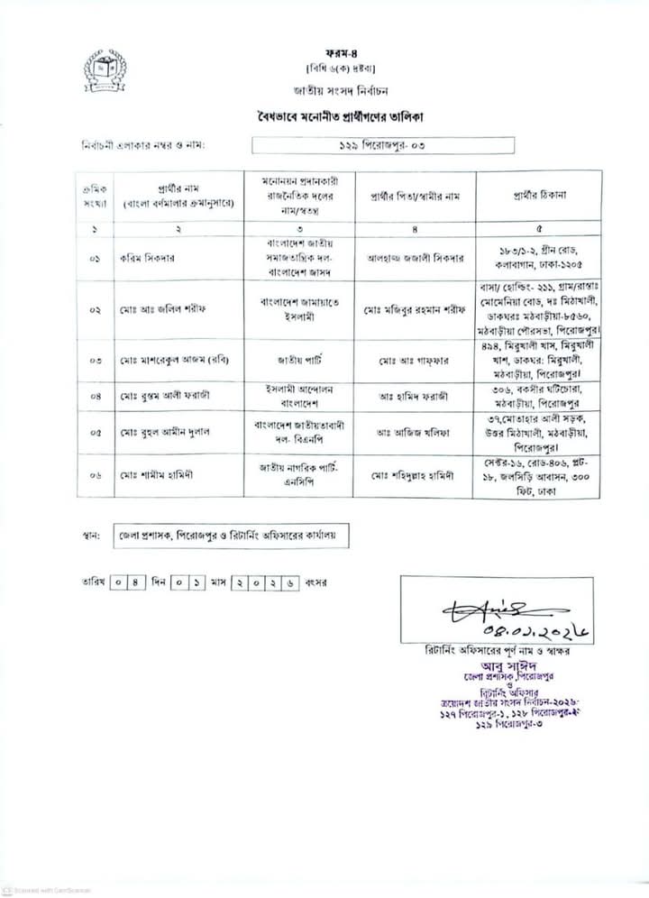 প্রার্থীদের নাম, পিতা/স্বামীর নাম ও ঠিকানাসহ বিস্তারিত তথ্য জেলা প্রশাসনের বিজ্ঞপ্তিতে উল্লেখ করা হয়েছে। জেলা রিটার্নিং কর্মকর্তা জানান, “নির্বাচন কমিশনের নির্দেশনা অনুযায়ী যাচাই-বাছাই শেষে যেসব প্রার্থীর মনোনয়নপত্র বৈধ হিসেবে বিবেচিত হয়েছে, তাদের তালিকা প্রকাশ করা হয়েছে। নির্বাচনকে অবাধ, সুষ্ঠু ও নিরপেক্ষ করতে প্রশাসন সর্বোচ্চ সতর্ক অবস্থানে রয়েছে।” এদিকে প্রার্থীদের তালিকা প্রকাশের পর এলাকায় রাজনৈতিক তৎপরতা বেড়েছে। ভোটারদের মাঝে কৌতূহল ও আলোচনা শুরু হয়েছে—কে হবেন জনগণের প্রকৃত প্রতিনিধি? স্থানীয়দের প্রত্যাশা: সচেতন ভোটাররা বলছেন, “আমরা উন্নয়ন ও সৎ নেতৃত্ব চাই। অপরাধী, চাঁদাবাজ কিংবা দখলদারদের আর সংসদে দেখতে চাই না।”