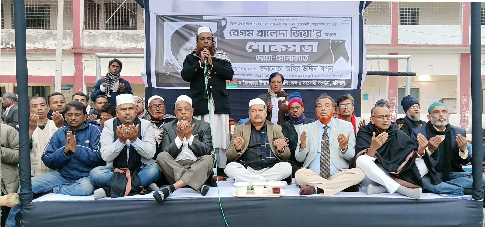 আগৈলঝাড়া (বরিশাল) প্রতিনিধিঃ তিনবারের সাবেক প্রধানমন্ত্রী বেগম খালেদা জিয়ার স্মরনে বরিশালের আগৈলঝাড়া শোকসভা ও দোয়া-মোনাজাত অনুষ্ঠিত হয়েছে। উপজেলার সকল শ্রেনী ও পেশার লোকজনের উদ্যোগে উপজেলা সদরের ভেগাই হালদার পাবলিক একাডেমী মাঠে গতকাল সাবেক এমপি জহির উদ্দিন স্বপনের সভাপতিত্বে সাবেক প্রধানমন্ত্রী বেগম খালেদা জিয়ার স্মরনে শোকসভা ও দোয়া-মোনাজাত অনুষ্ধিসঢ়;ত হয়।