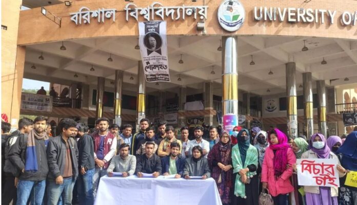 বরিশাল বিশ্ববিদ্যালয়ের বাংলা বিভাগের শিক্ষার্থী শুভ বৈরাগীকে প্রেমের সম্পর্ককে কেন্দ্র করে শারীরিক ও সামাজিকভাবে হেনস্তার মাধ্যমে আত্মহত্যায় বাধ্য করা ব্যক্তিদের গ্রেফতারের দাবিতে মানববন্ধন ও সংবাদ সম্মেলন অনুষ্ঠিত হয়েছে। মঙ্গলবার (৬ জানুয়ারি) দুপুর ১২টায় বিশ্ববিদ্যালয়ের ৩ নম্বর গেটের সামনে মানববন্ধন শেষে সংবাদ সম্মেলন করেন বিশ্ববিদ্যালয়ের শিক্ষার্থীরা।