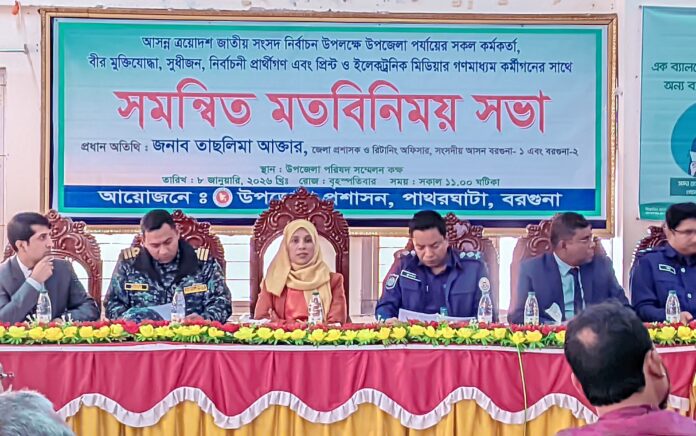 বৃহস্পতিবার (৮ জানুয়ারি) সকাল ১১টায় পাথরঘাটা উপজেলা পরিষদ হলরুমে অনুষ্ঠিত সভায় উপজেলার সকল পর্যায়ের কর্মকর্তা, বীর মুক্তিযোদ্ধা, সুধীজন, নির্বাচনী প্রার্থী, রাজনৈতিক ব্যক্তিবর্গ ও গণমাধ্যমকর্মীরা অংশগ্রহণ করেন।