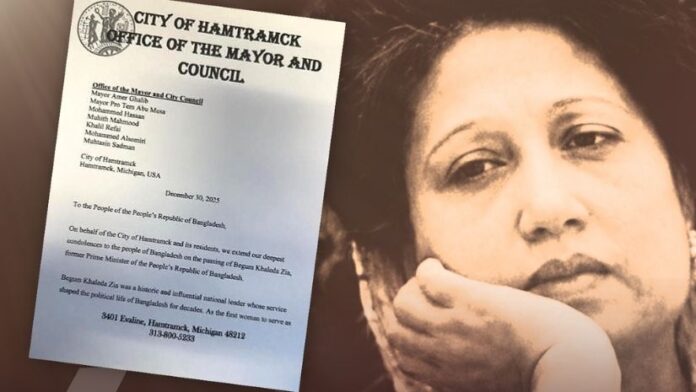বাংলাদেশের তিনবারের সাবেক প্রধানমন্ত্রী ও বিএনপির সাবেক চেয়ারপারসন প্রয়াত বেগম খালেদা জিয়ার নামে যুক্তরাষ্ট্রের মিশিগান অঙ্গরাজ্যে একটি সড়কের অংশের নামকরণ করা হয়েছে। হ্যামট্রামিক সিটি কাউন্সিল জোসেফ ক্যাম্পাউ অ্যাভিনিউ ও কোনান্ট স্ট্রিটের মধ্যবর্তী কার্পেন্টার স্ট্রিটের একটি অংশের নাম পরিবর্তনের প্রস্তাব অনুমোদন দিয়েছে।