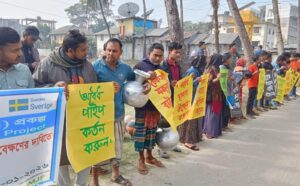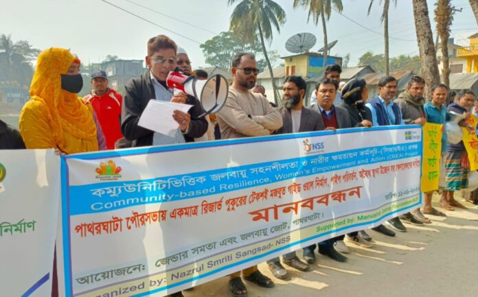 এ মানববন্ধনে পুকুর খনন করা, ওয়াল নির্মাণ করা, অবৈধ উচ্ছেদ করা, মানসম্মত ফিল্টার নির্মাণ করার কথা বলা হয়েছে। জেন্ডার সমতা ও জলবায়ু জোটের আয়োজনে ও মানুষের জন্য ফাউন্ডেশনের সহযোগিতায় রোববার (১১ জানুয়ারি) ১১টায় পাথরঘাটা পৌর শহরের জীবনরক্ষাকারী ও প্রাণখ্যাত রিজার্ভ পুকুর পাড়ে খালি কলসি নিয়ে কয়েক শতাধিক মানুষ উপস্থিত ছিলেন।