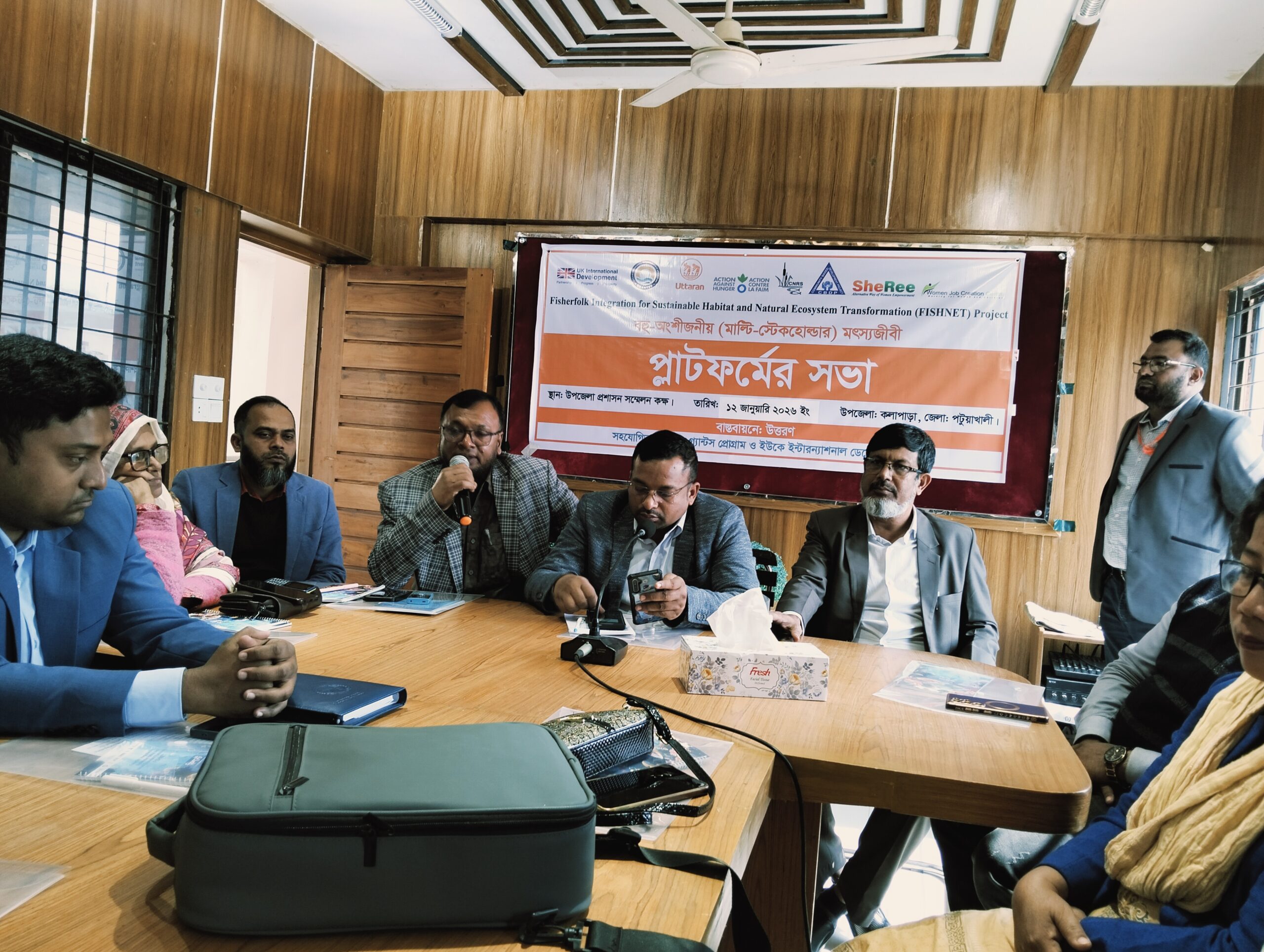 সভায় সভাপতিত্ব করেন কলাপাড়া উপজেলা প্রকল্প বাস্তবায়ন কর্মকর্তা মোকছেদুল আলম। ফিসনেট প্রকল্পের এরিয়া ম্যানেজার আবু এমরানের সঞ্চালনায় প্রকল্পের লক্ষ্য, উদ্দেশ্য ও কর্মপরিকল্পনা উপস্থাপন করেন প্রকল্পের এডভোকেসি অফিসার মিজানুর রহমান। ফিসনেট প্রকল্পের অধীনে কলাপাড়ার বিভিন্ন প্রকল্পের করনীয় বিষয় বক্তব্য রাখেন বিশেষ অতিথি সিপিপির সহকারী পরিচালক আছাদ উজ জ্জামান, সমবায় কর্মকর্তা আব্বাস আলী, মহিলা বিষয়ক কর্মকর্তা তাসলিমা আক্তার, পানি উন্নয়ন বোর্ডের উপ বিভাগীয় প্রকৌশলী ইমরান হোসেন রাব্বি প্রমুখ।